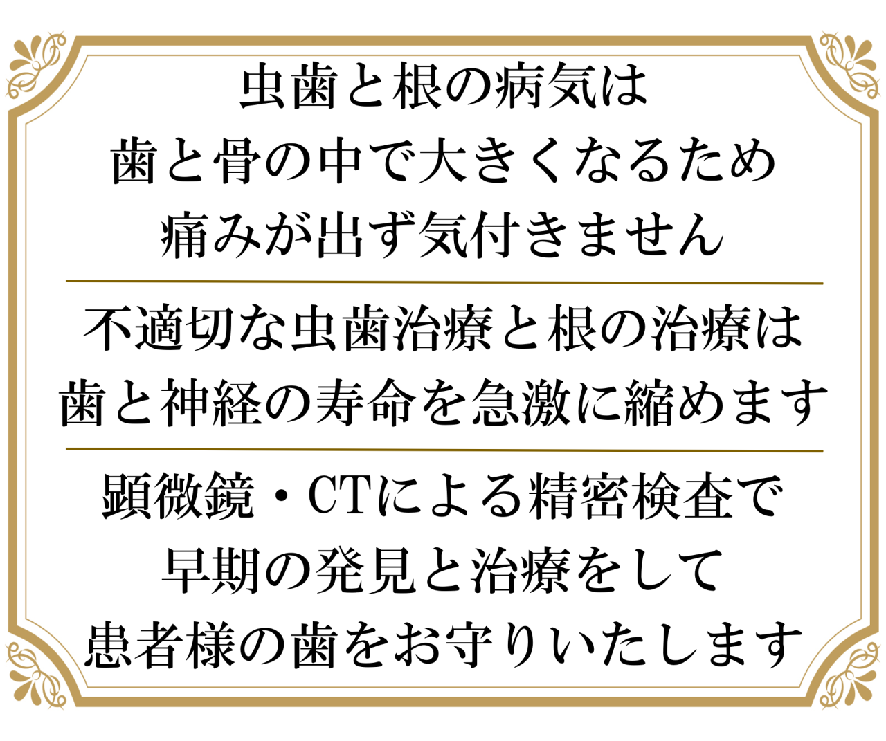 当院は顕微鏡や歯科用CT、マイクロスコープなどを設置して、患者さまに精密な検査・治療を提供しています。しっかりお口の状況を確認させていただいた上で、ご自身に合った治療を一緒に検討させていただきます。