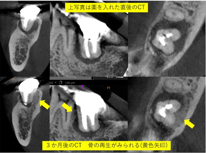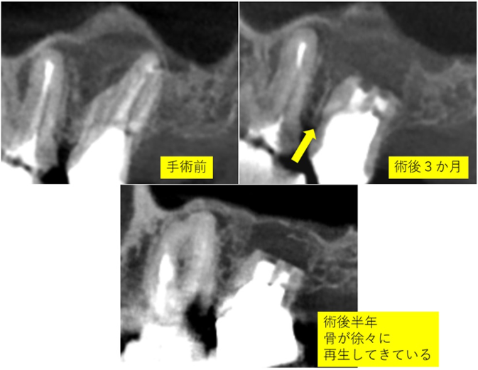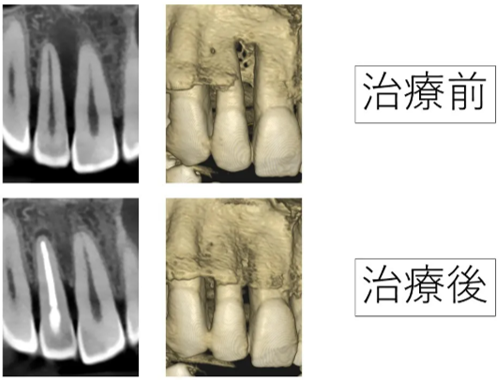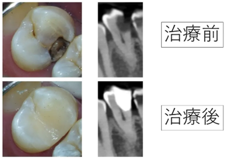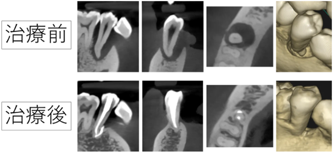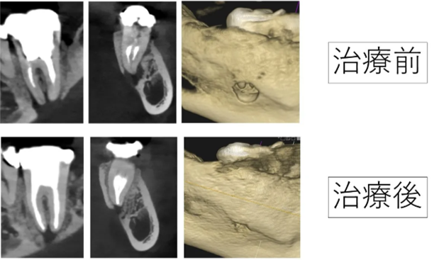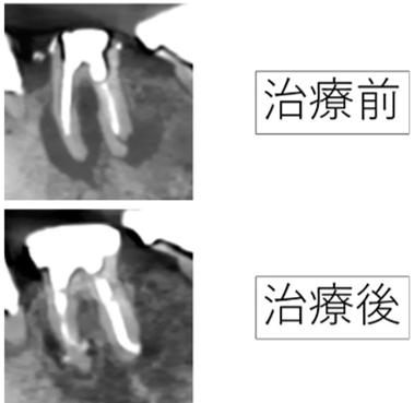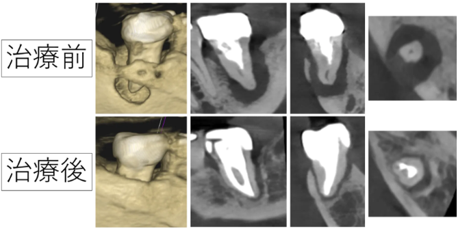 根の大きな病気で骨が溶け穴に。精密な根管治療で骨が再生した症例
