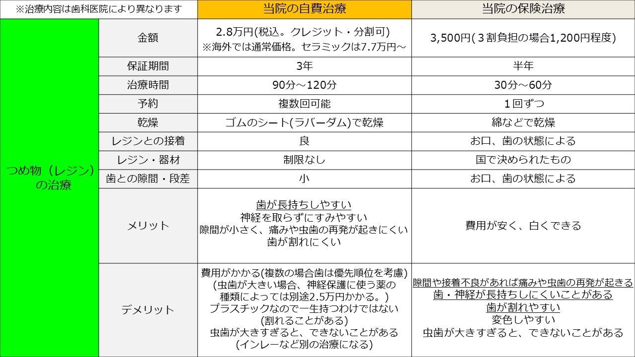 ①レジン治療(虫歯治療):現在自費治療のみ。