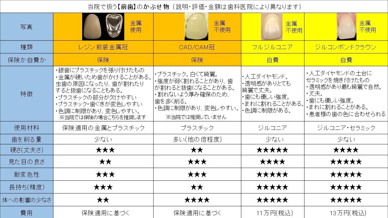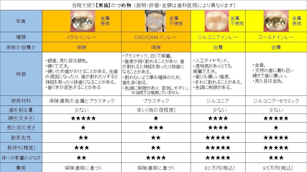 かぶせ物とつめ物(歯型を取って作る物)について、種類と特徴などまとめた表です。
