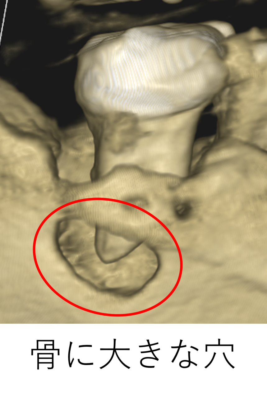 精密に検査するため、CTを撮影した所、予想以上に大きな病気で骨が溶けてしまっていることが分かりました。特に内側の骨が完全に貫通し、大きな穴があいています。これでは抜いた方が良いと言われても無理はありません。