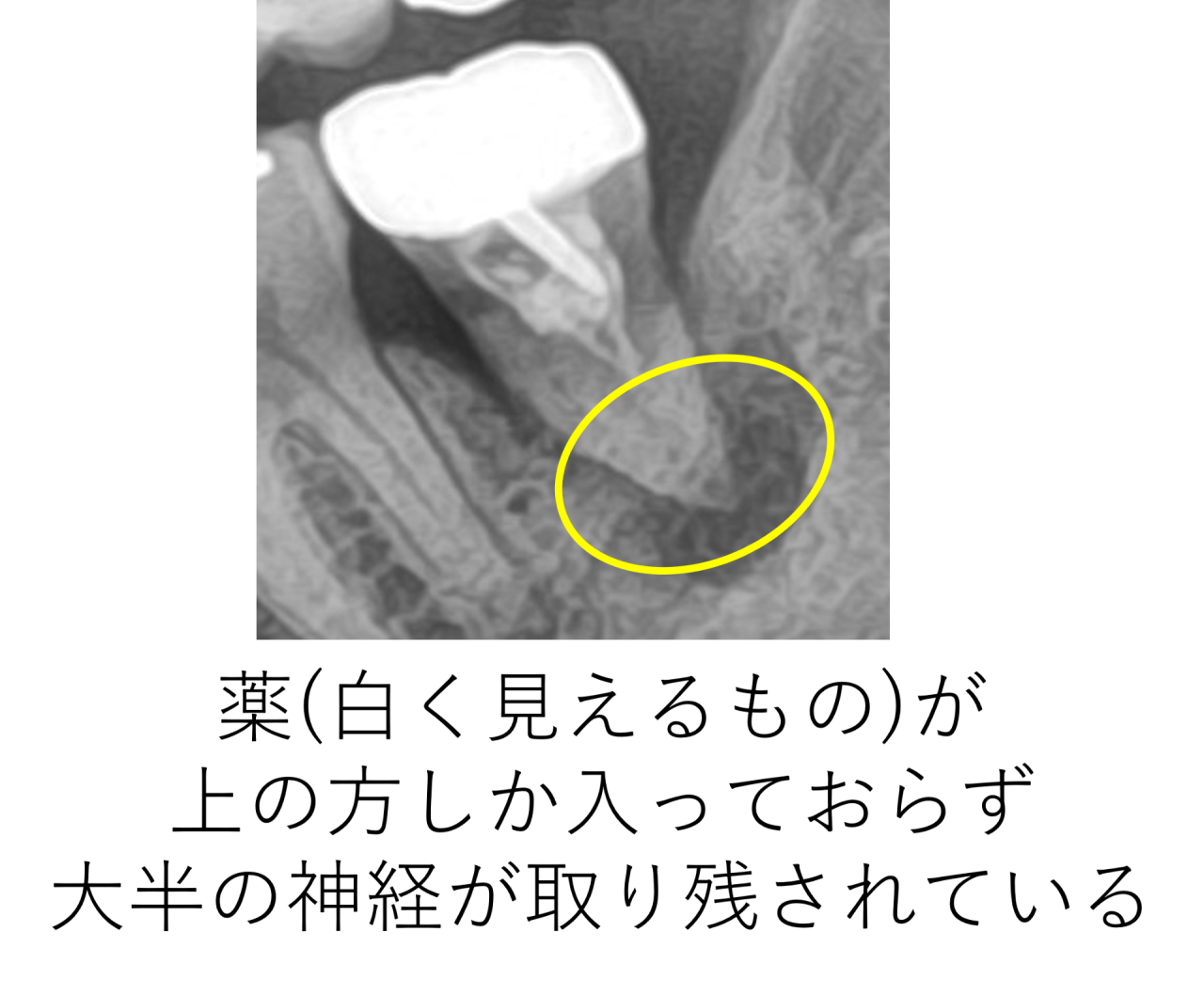 神経が上の方しか取られておらず、大半が取り残されています。この歯は奥歯の中でも一番奥の歯になります。肉眼ではほとんど見えません。手探りでなんとなくの治療になってしまいます。わからないところは触らずに治療を終わらせるしかないのです。取り残された神経は腐って死んでしまうので、そこから細菌が繁殖し、大きな根の病気を作ります。