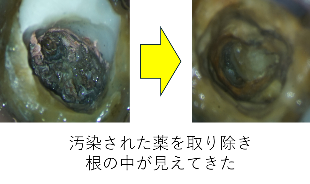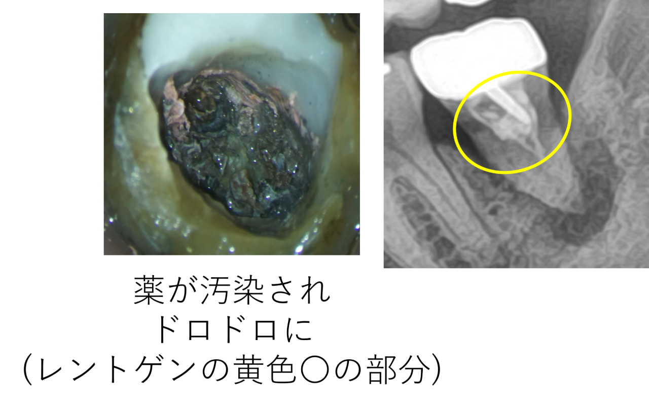 かぶせ物を外して、根の中を見たところ、以前の治療でつめられてた薬が完全に汚染され、黒くドロドロになっていました。このまま放置していれば、完全に骨は溶けてしまい抜け落ちていたでしょう。