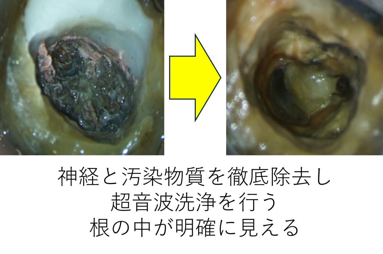 専用の器具で超音波洗浄を行い、根の中が綺麗になったことが確認できました。また、歯は割れていませんでした。
