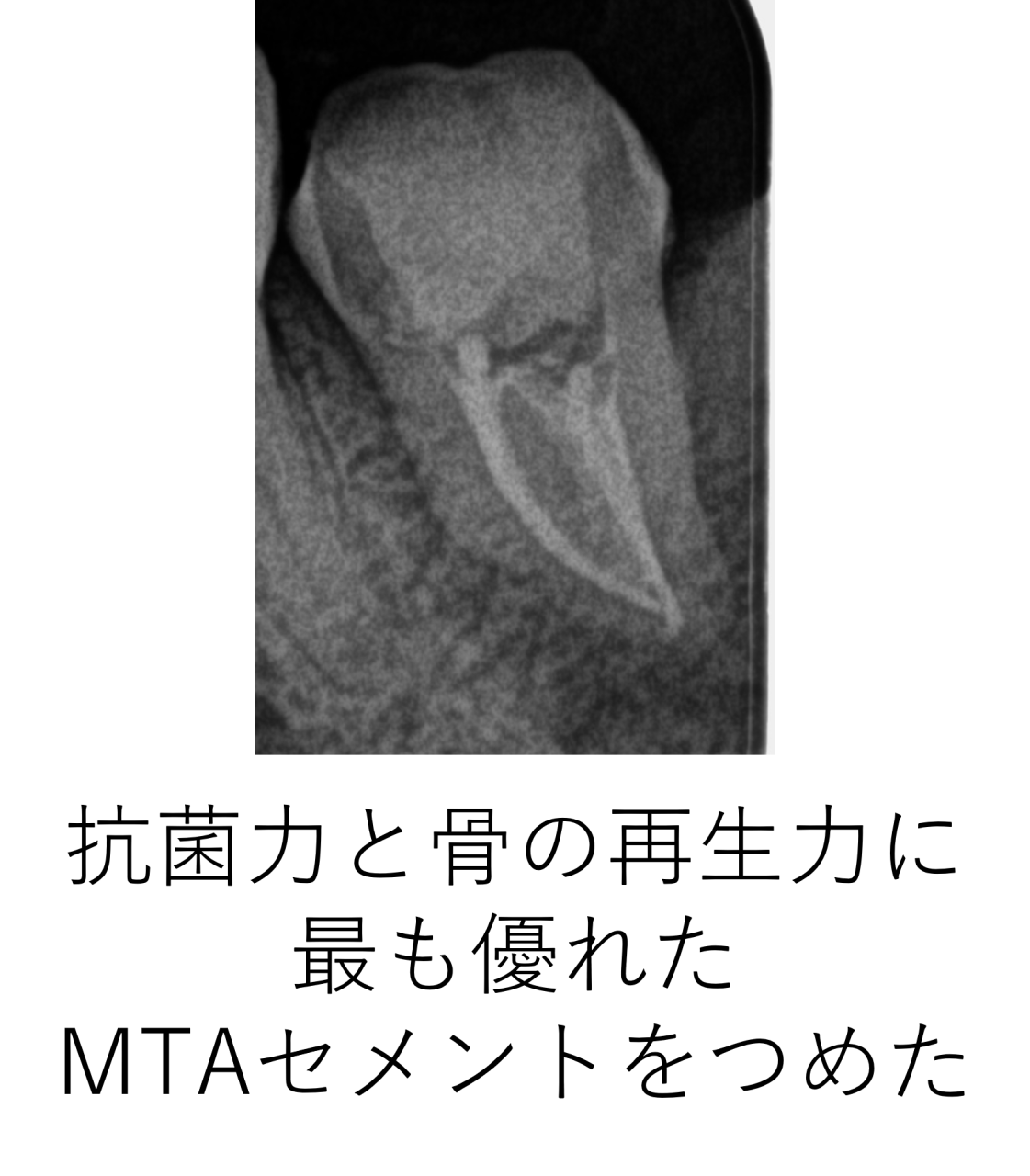 次回の来院時、患者様は痛みもなく違和感も無くなったとのことで、歯の状態も良かったため最終的な抗菌剤(薬)をつめて完了しました。抗菌剤は現在最も長期に渡り抗菌作用が続き、骨を再生する能力が高いMTAセメントを使用しました。