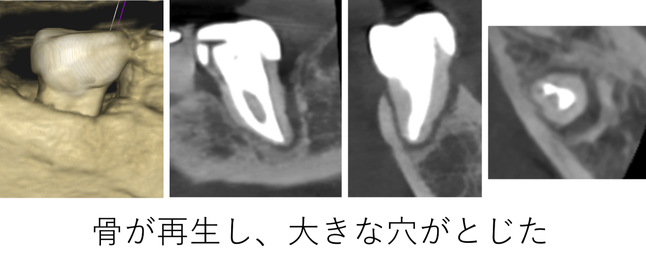 治療後は経過観察を行いました。1年経過し、患者様は引き続き痛みもなく食事ができているとのことで、CTを撮影しました。すると、溶けていた骨はほとんど再生しており、大きな穴は完全にふさがって(とじて)いました。