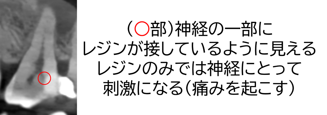 つめ物はレジンというプラスチック樹脂ですが、神経に直接接してしまうと、刺激になってしまい痛みが出ることがあります。この歯は虫歯治療直後から痛みが出始めているので、これが原因ではないかと予想しました。