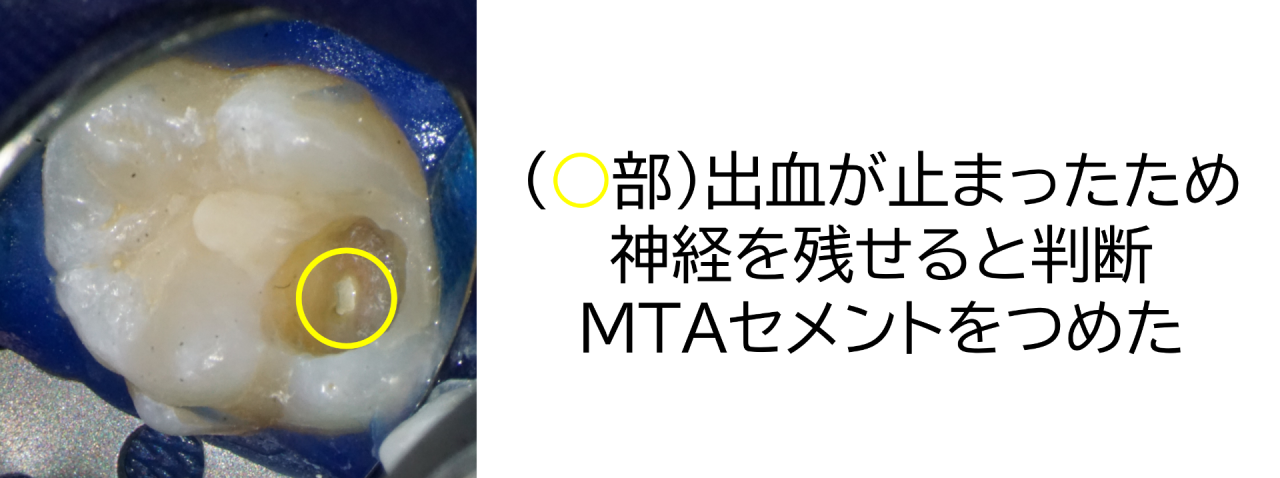 出た一部の神経にMTAセメントをつめて、その上に再度レジンをつめ直しました。
