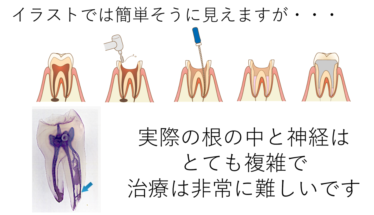 神経を抜くことは簡単ではありません。神経はイラストでは簡単なように書かれていますが、実際の神経は曲がっていたり、細かく枝分かれをしています。高い技術と設備がないと、神経の取り残しが起こってしまいます。