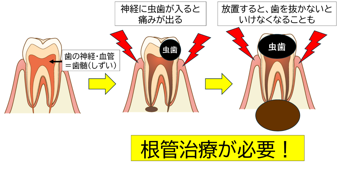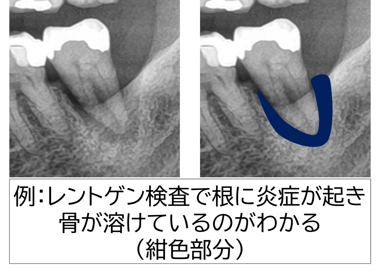 これにより、ズキズキとした痛みが出たり、根の先に膿がたまったりすることがあります。