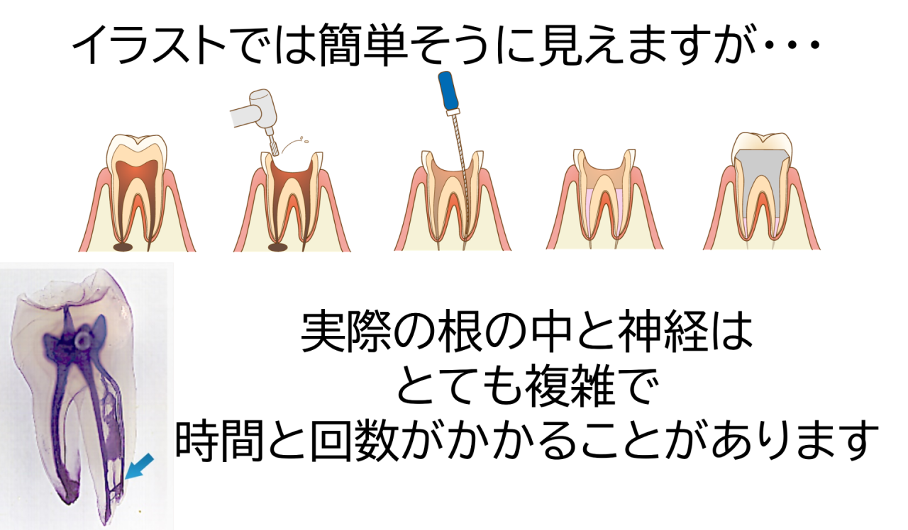 その理由は、根の中の構造が複雑で、感染部分をすべて取り除くためには、回数を分けて慎重に処置を進める必要があるからです。