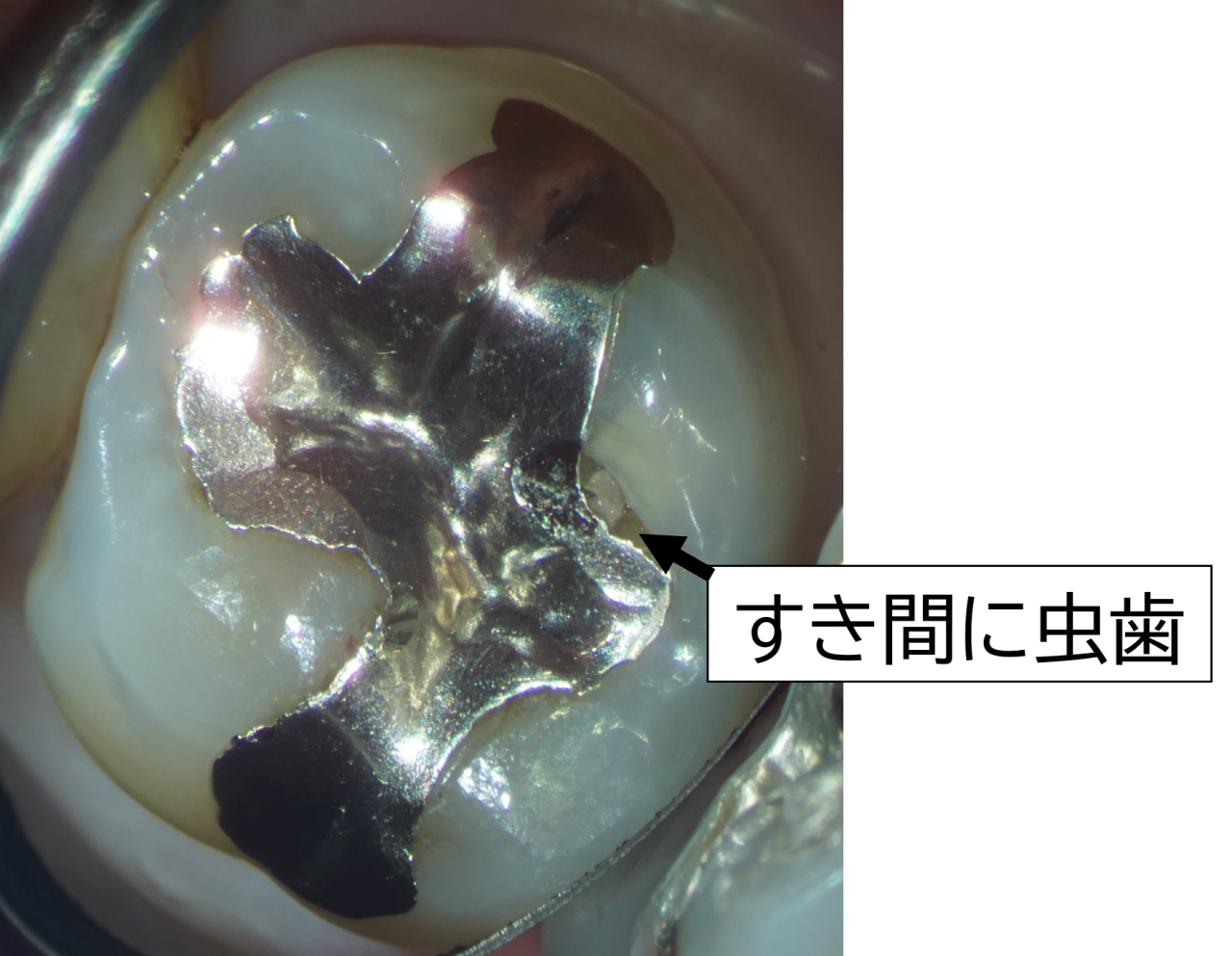 歯を診査すると、銀歯と歯の間にすき間があり、虫歯の穴が開いています。硬い銀歯で歯がかけて、そこに虫歯菌が入って虫歯ができたものと考えられます。