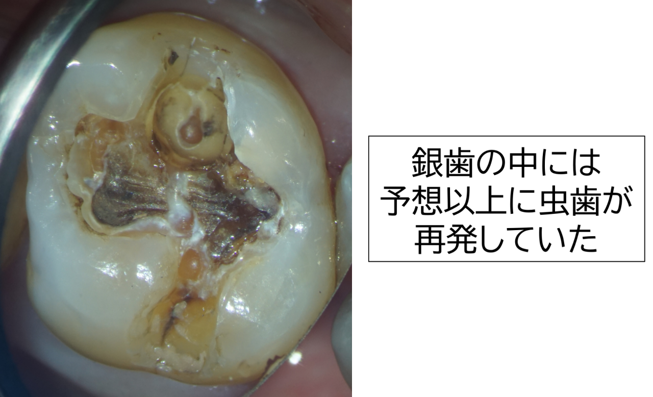 虫歯を取り切って確認すると、歯に多くのヒビ割れが起きていました。銀歯が硬く歯を割りやすいために起きたものと考えられます。