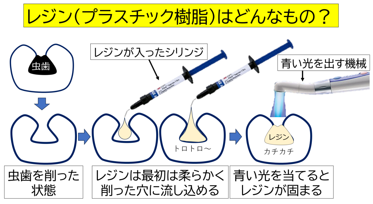 レジンとはプラスチック樹脂のことです。虫歯を削ってできた穴に直接つめます。レジンは最初トロトロで柔らかく、細かい所までつめることができます。そして、青い光を当てると硬く固まります。