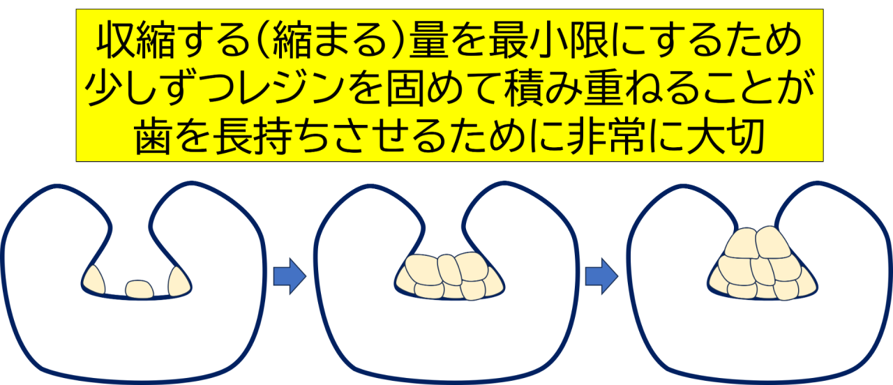 そのため、レジンを何も考えずに詰めてしまうと、歯と接する部分が増え、硬化時の収縮する力が一か所にかかりやすくなります。結果として、接着が不安定になったり、わずかなすき間やヒビの原因になったりすることがあります。
