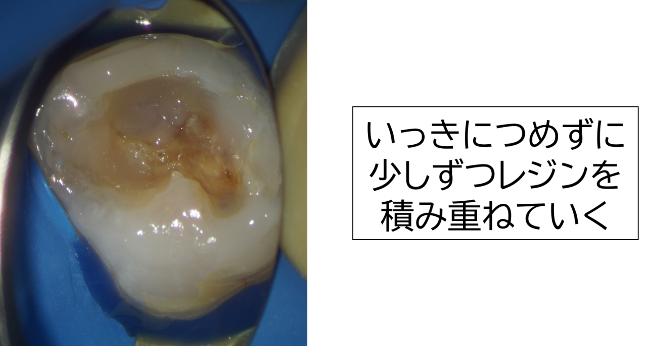 だからこそ、少しずつ材料を入れるだけではなく、できるだけ接着する面をコントロールしながら処置を進めることが大切です。