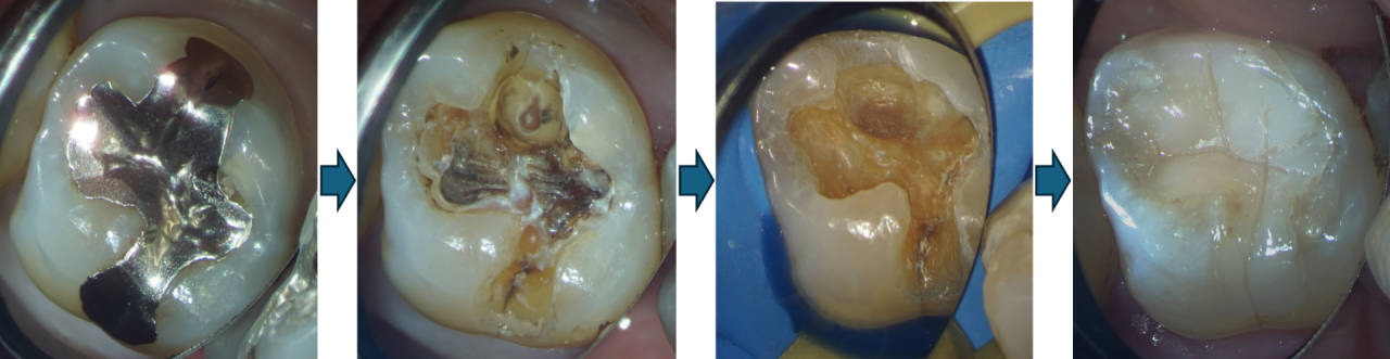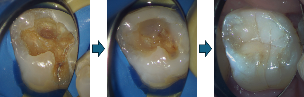 今回のケースでは、再発した虫歯を丁寧に取り除いたあと、レジン(プラスチック樹脂)による修復を行いました。