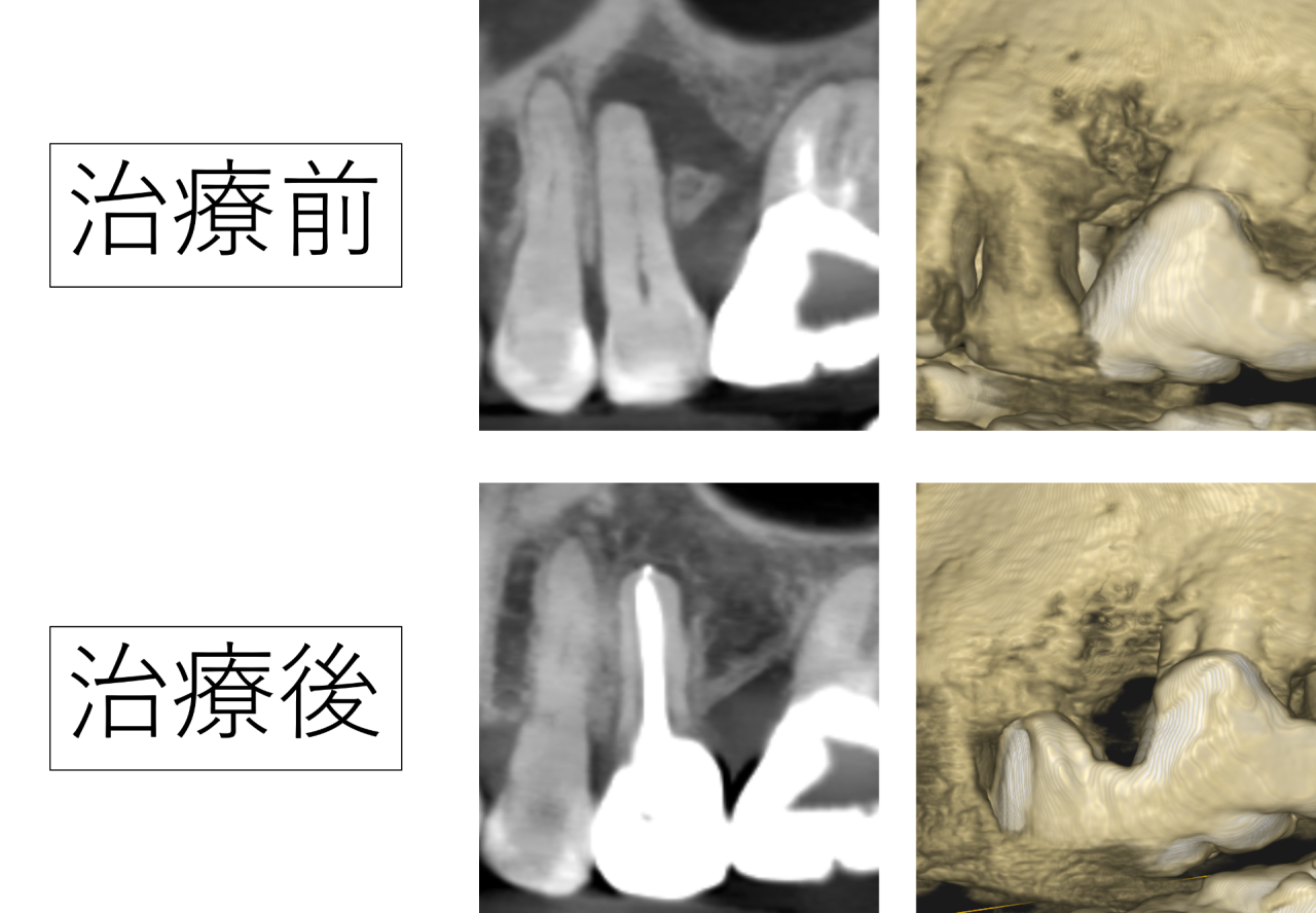 治療前に大きく写っていた黒い影は、時間の経過とともに小さくなり、骨の回復が確認できました。