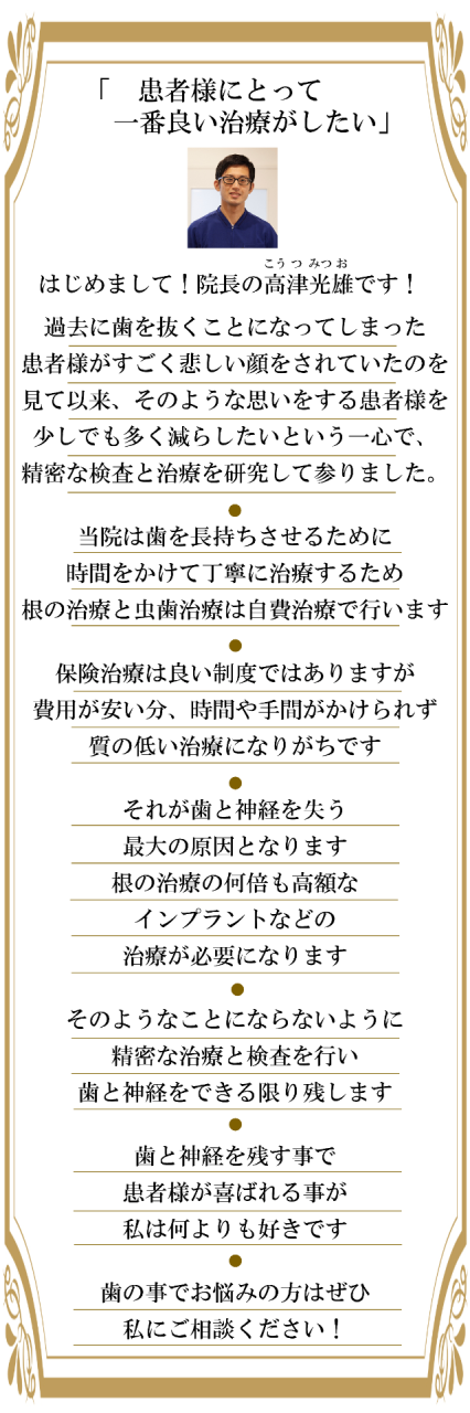当院院長の高津光雄は「歯と歯の神経を残す事」「歯を長持ちさせること」を専門に行っております。(歯と歯の神経を残す治療は累計2000症例以上)