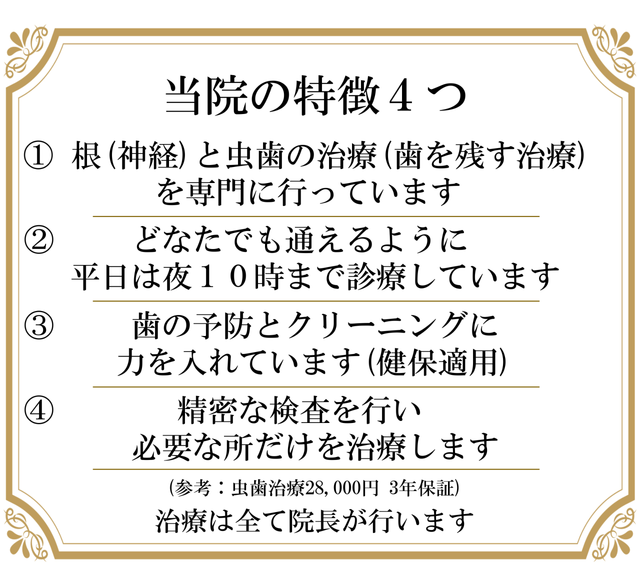 それをできる限り防いで歯を守るため、精密な検査を行っております。治療とそれにかかる治療費を必要最低限にしております。